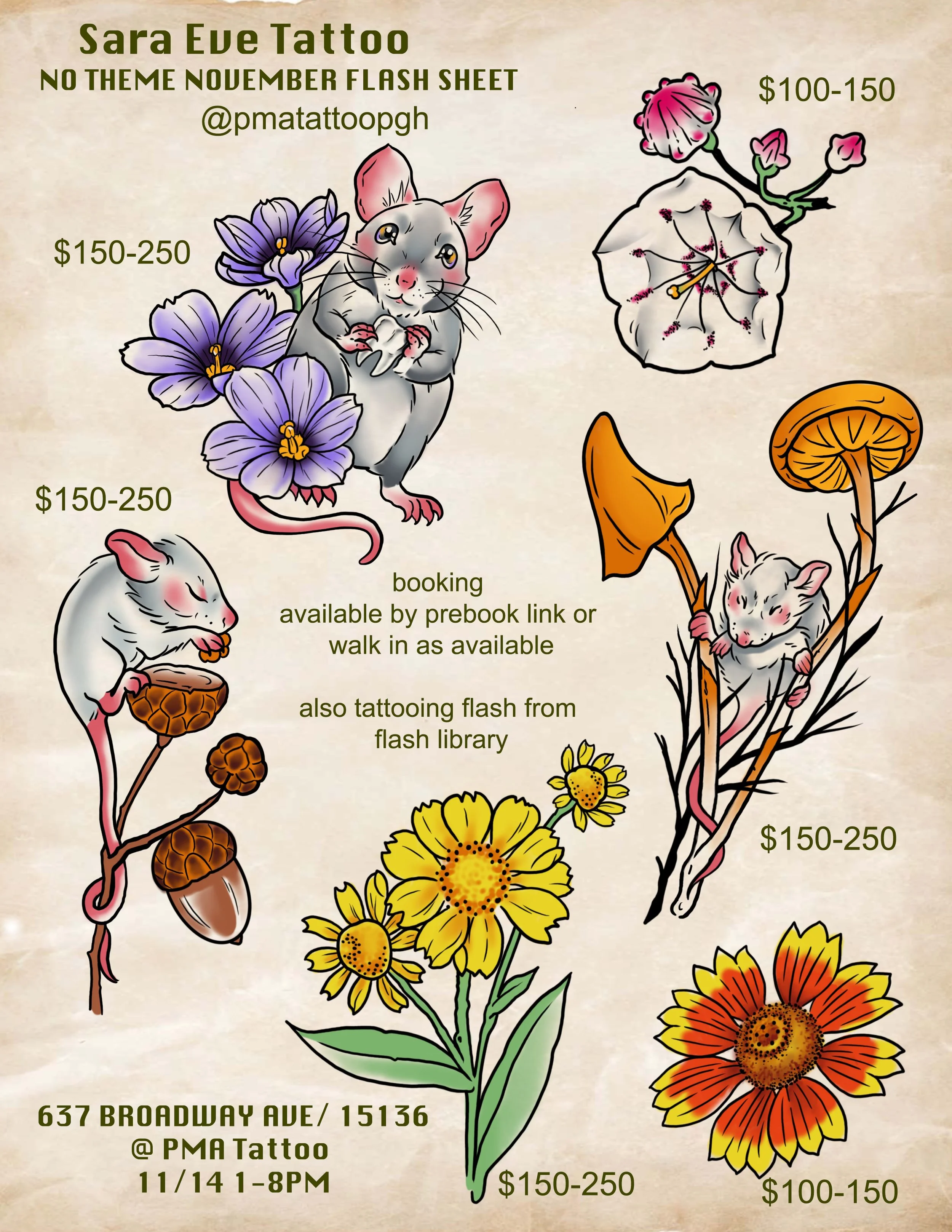 As sheets are completed they will be posted on our instagram as well as added to this blog for yinz. As always, on this date flash sheets as well as designs from our flash library are eligible for booking. Appointments are available as walk-in and prebook (links below).
